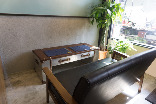 どっしり座りたくなるようなソファ。テーブルもおしゃれ!