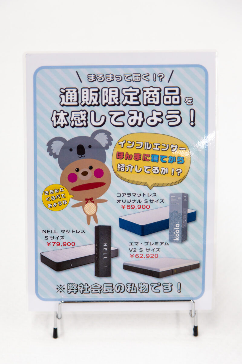 会長の私物ですが、通販限定のマットレスも展示していますよ