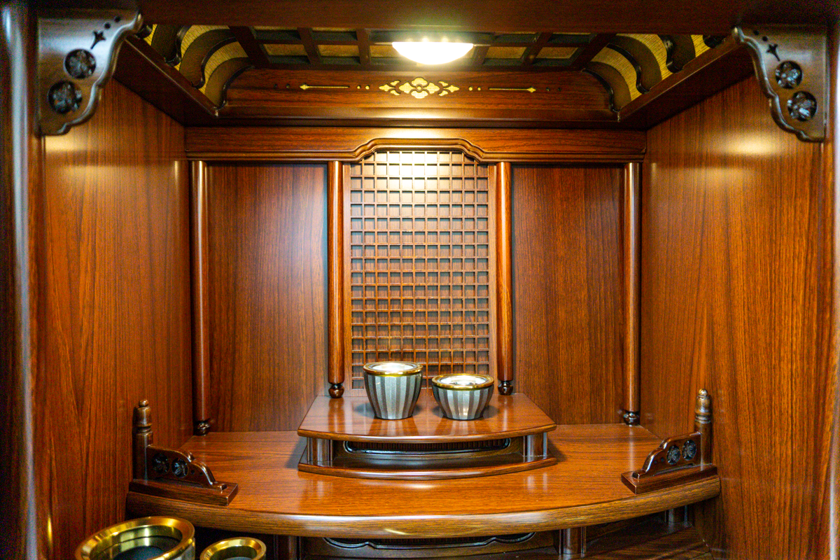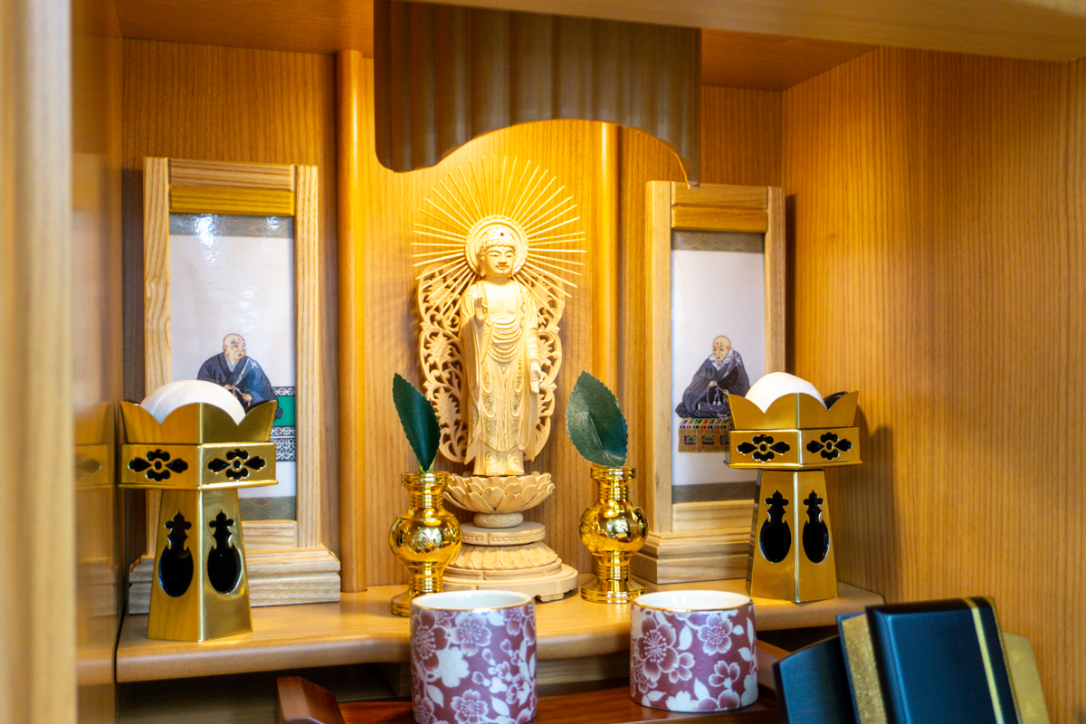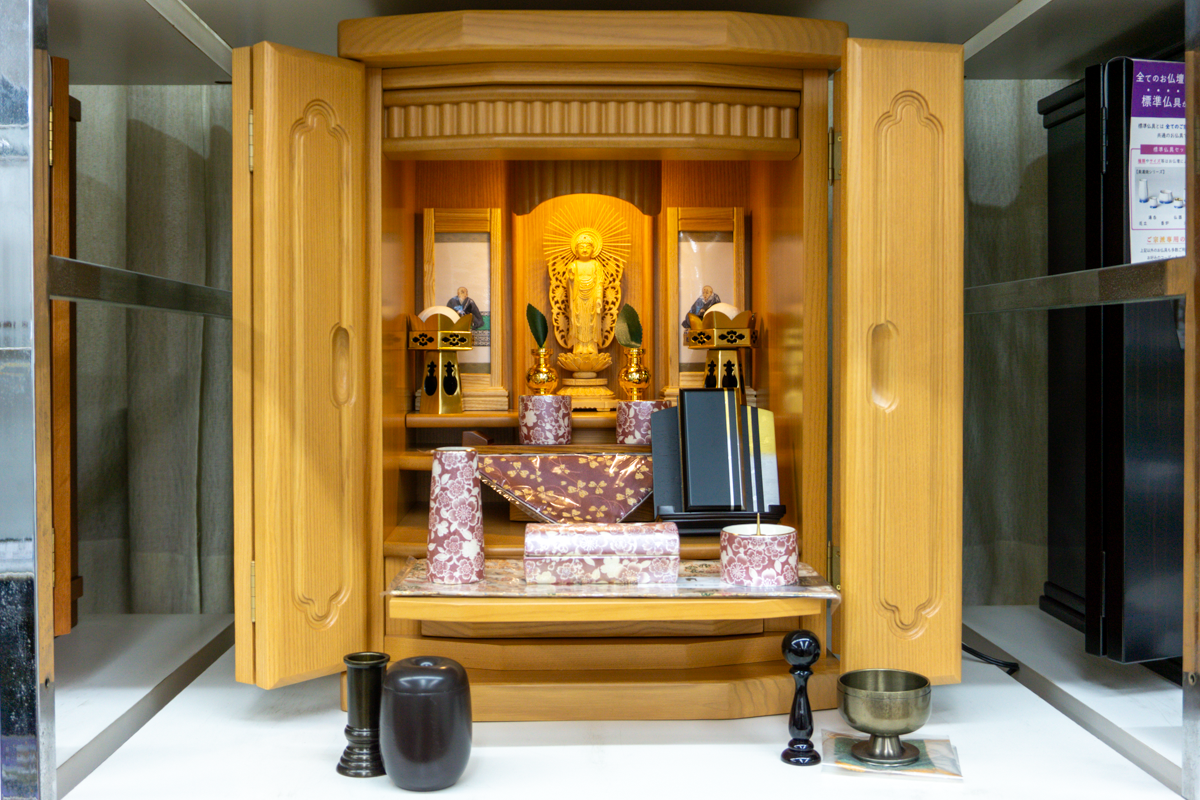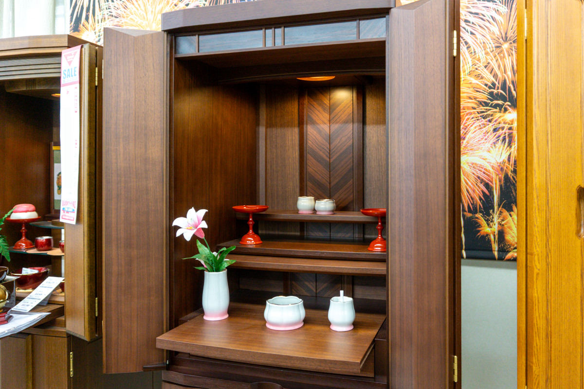 宗派ごとに仏具も異なるため、宗派に合わせた仏具を配置した仏壇も展示してありますよ。